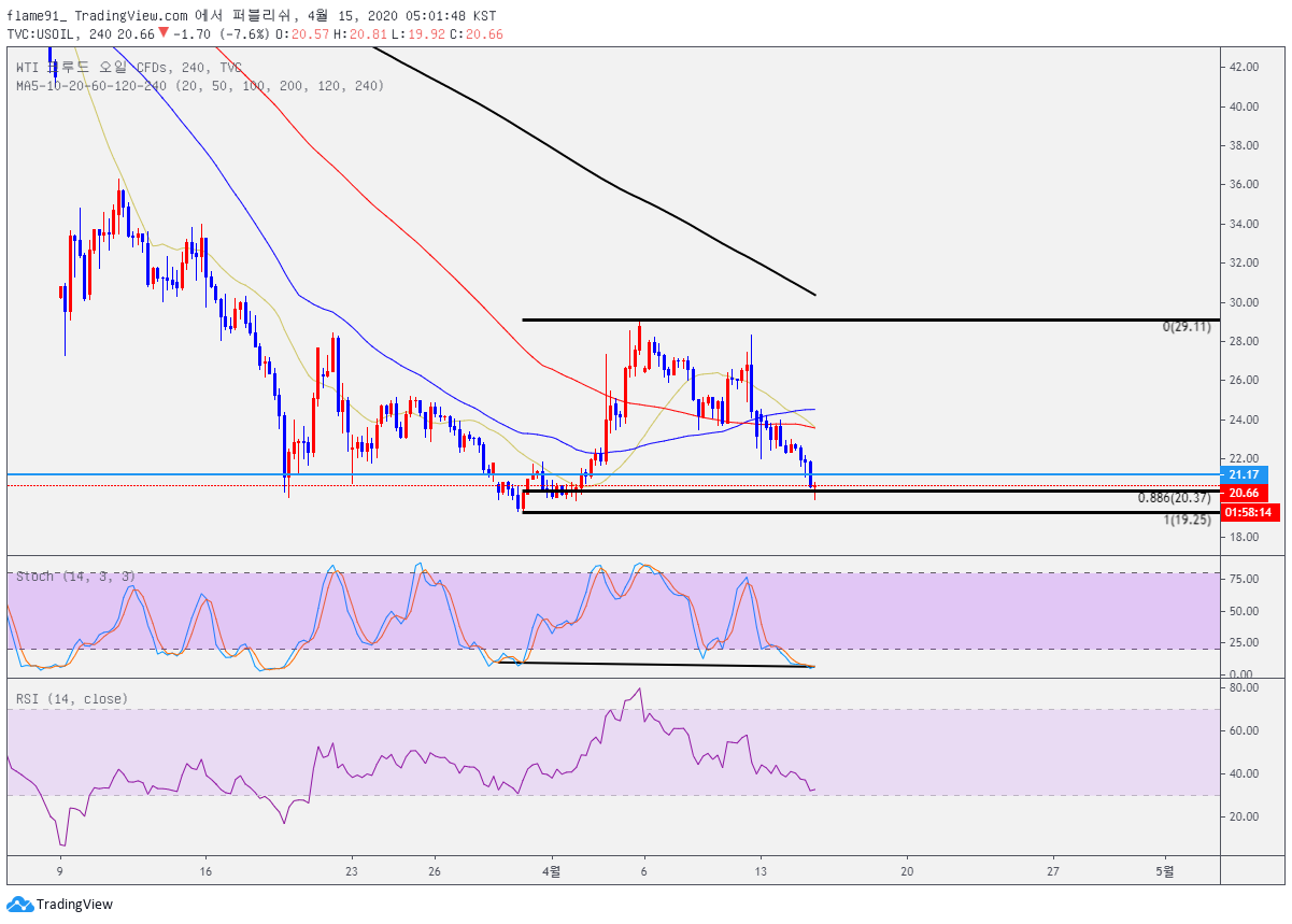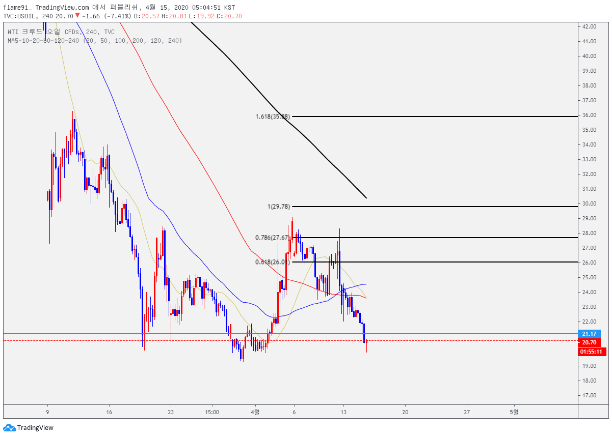 크루드 오일이 다시 2주전 가격인 20불대로 회귀했습니다.